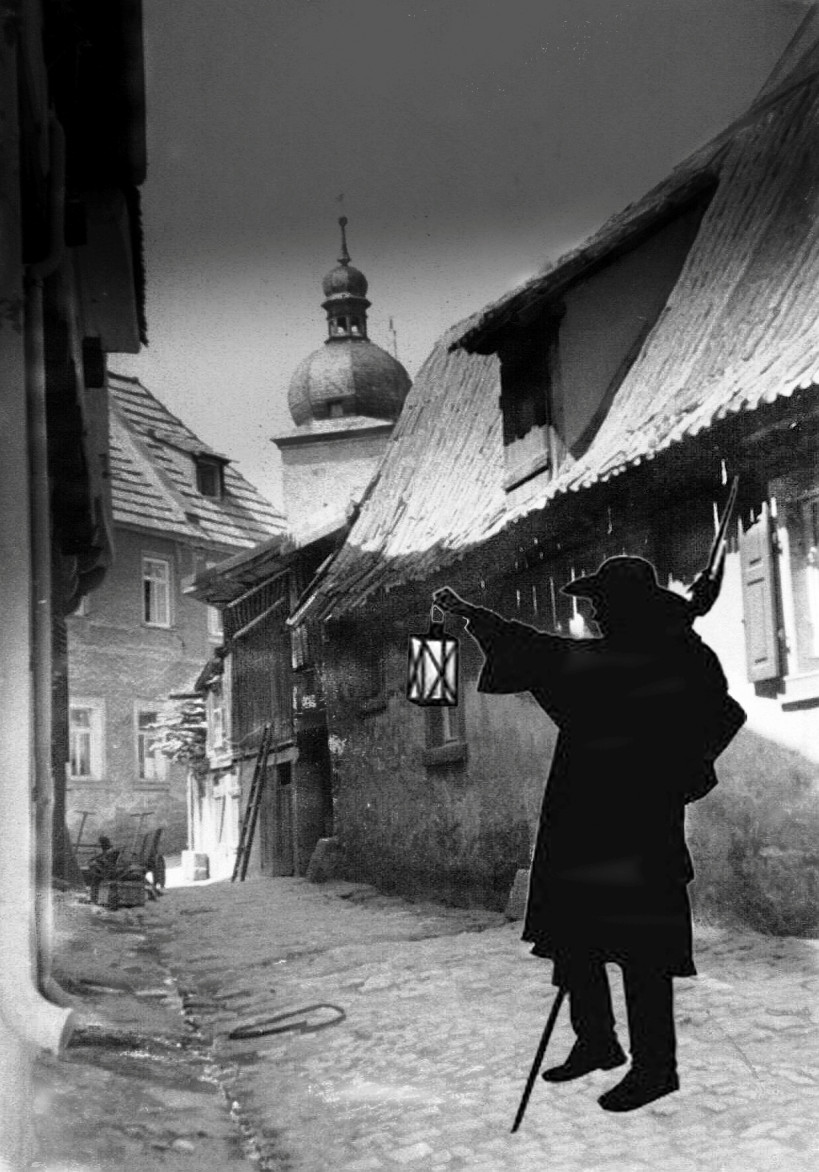 07 Nachwächter (alternativ) Bei Übertretung der Sperrstunde kassierte der Nachtwächter früher die „Hockersteuer“ Bild; Montage: Ludwig Leisentritt